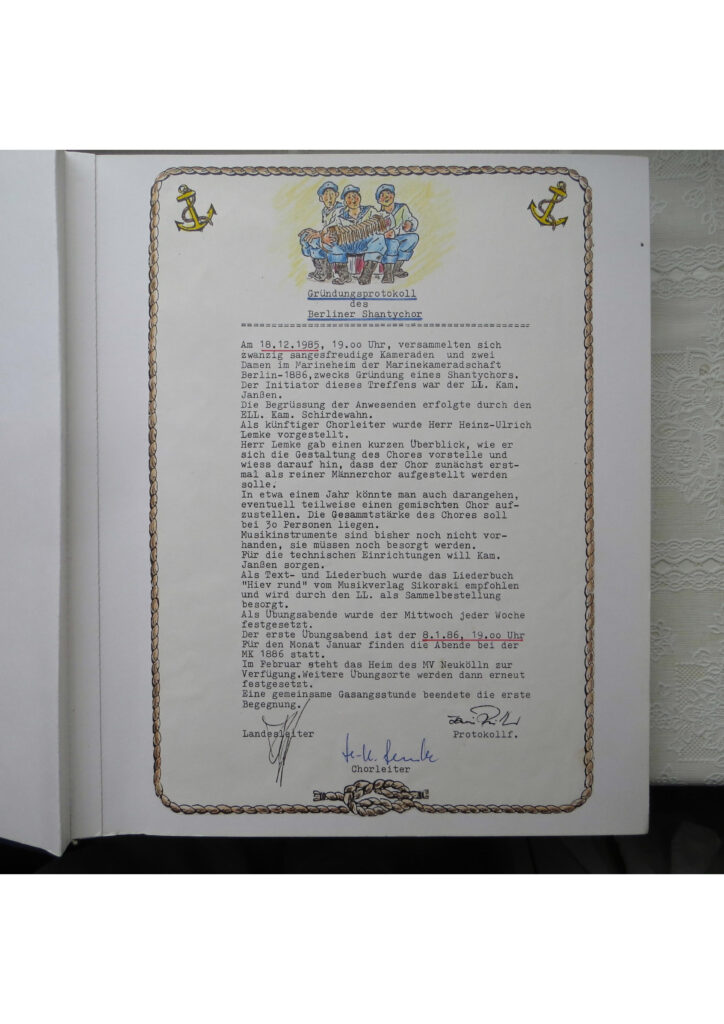 Im Shanty-Chor Reinickendorf wurden über Jahre und Jahrzehnte umfangreiche Jahrbücher geführt – dort finden sich alte Zeitungsartikel neben Gedichten und Berichten zum Leben im Chor. Man merkt schon beim Durchblättern – Chor ist weit mehr als „nur“ Singen. Wir danken den Chormitgliedern für das Öffnen ihrer Archive.
